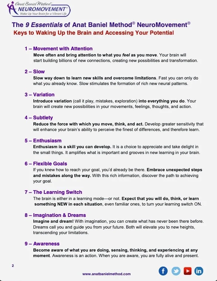 • The best way to learn about Neuromovement® is to try it. It’s not like PT. It’s about gentle, guided movements based in physics, focused on brain to bone connection. It is not energy healing, though connection between practitioner and client is crucial. The practitioner is deeply rooted in seeing all the possibilities for the client. If there is a feeling of pain or massage, then it is NOT Neuromovement®. When identifying “woowoo” we look for mysticism, pseudoscience, or a lack of scientific evidence. Feldenkrais, who Anat Baniel apprenticed with and worked with for decades, and Neuromovement® (her work based in Feldenkrais’) are scaled works with intense multi-year training, with highly-specific movements studied by some of neuroscience’s greatest minds. Reading Anat’s books and checking out videos on her youTube channel are recommended.